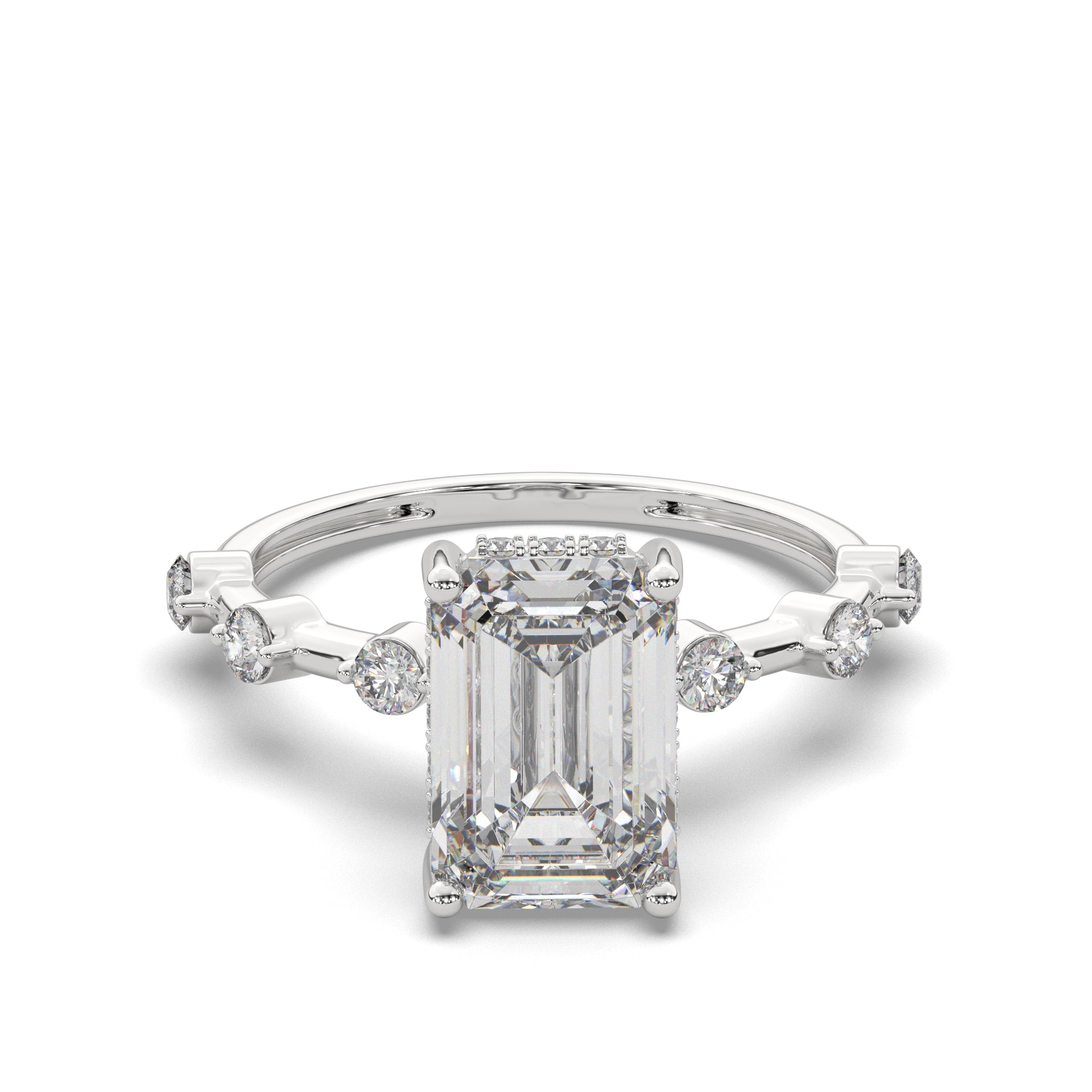 Emerald-Cut Diamond Hidden Halo Engagement Ring with Round Accent Diamonds